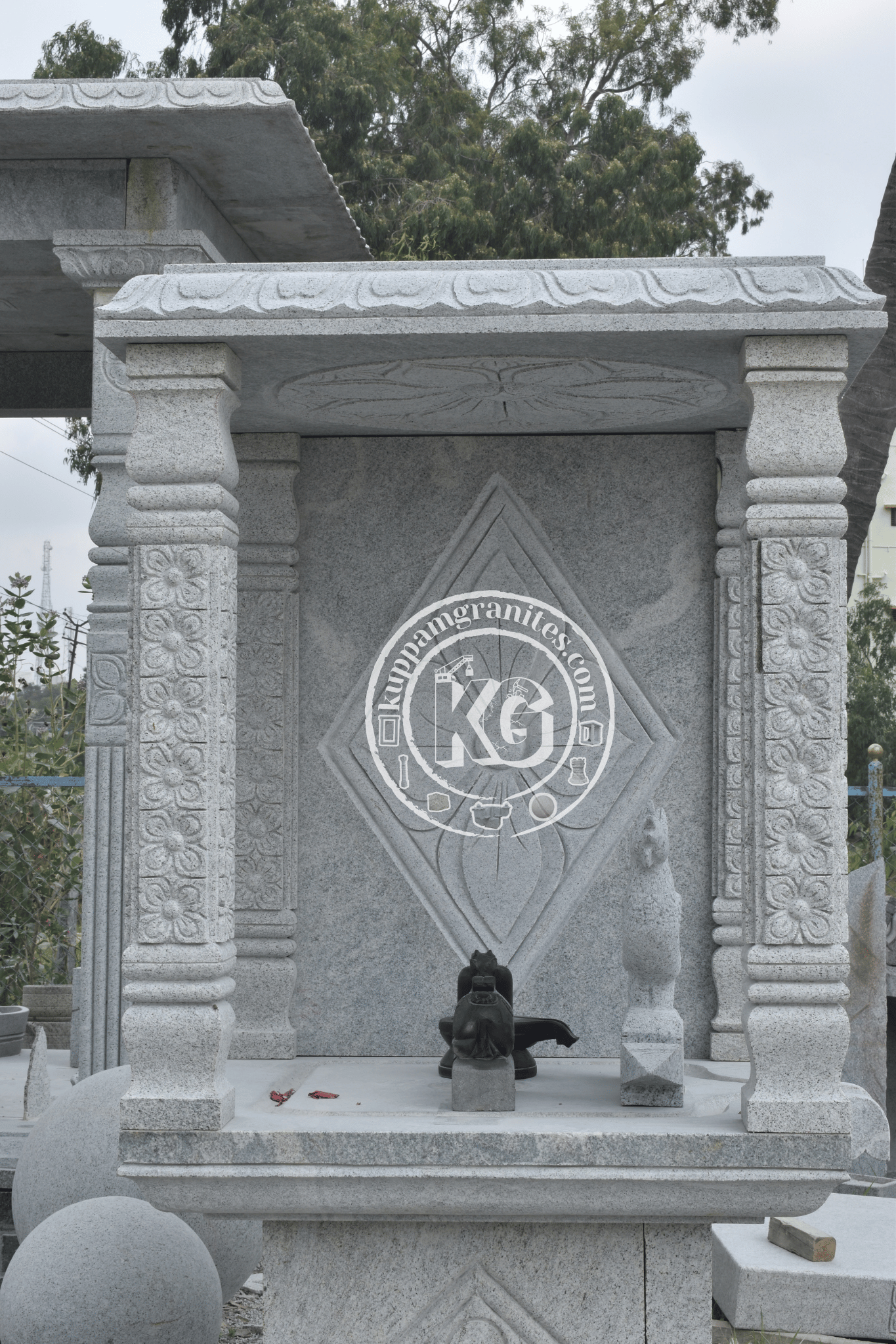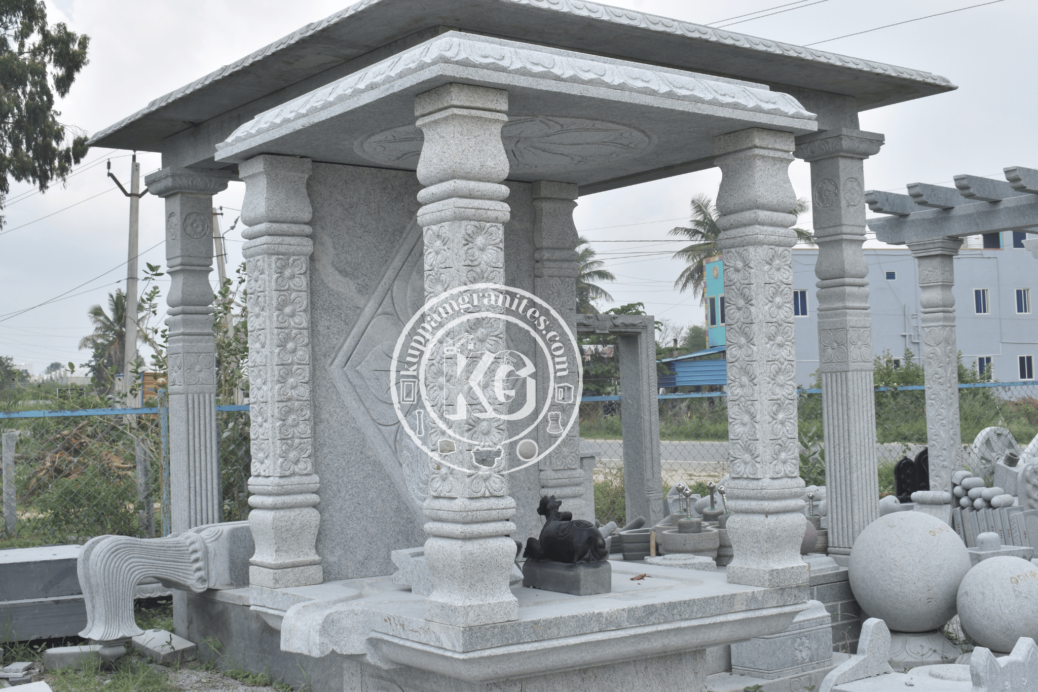 This intricate granite pavilion features floral-carved pillars and a decorative ceiling, adorned with traditional motifs. Ideal for temples or outdoor sanctuaries.
