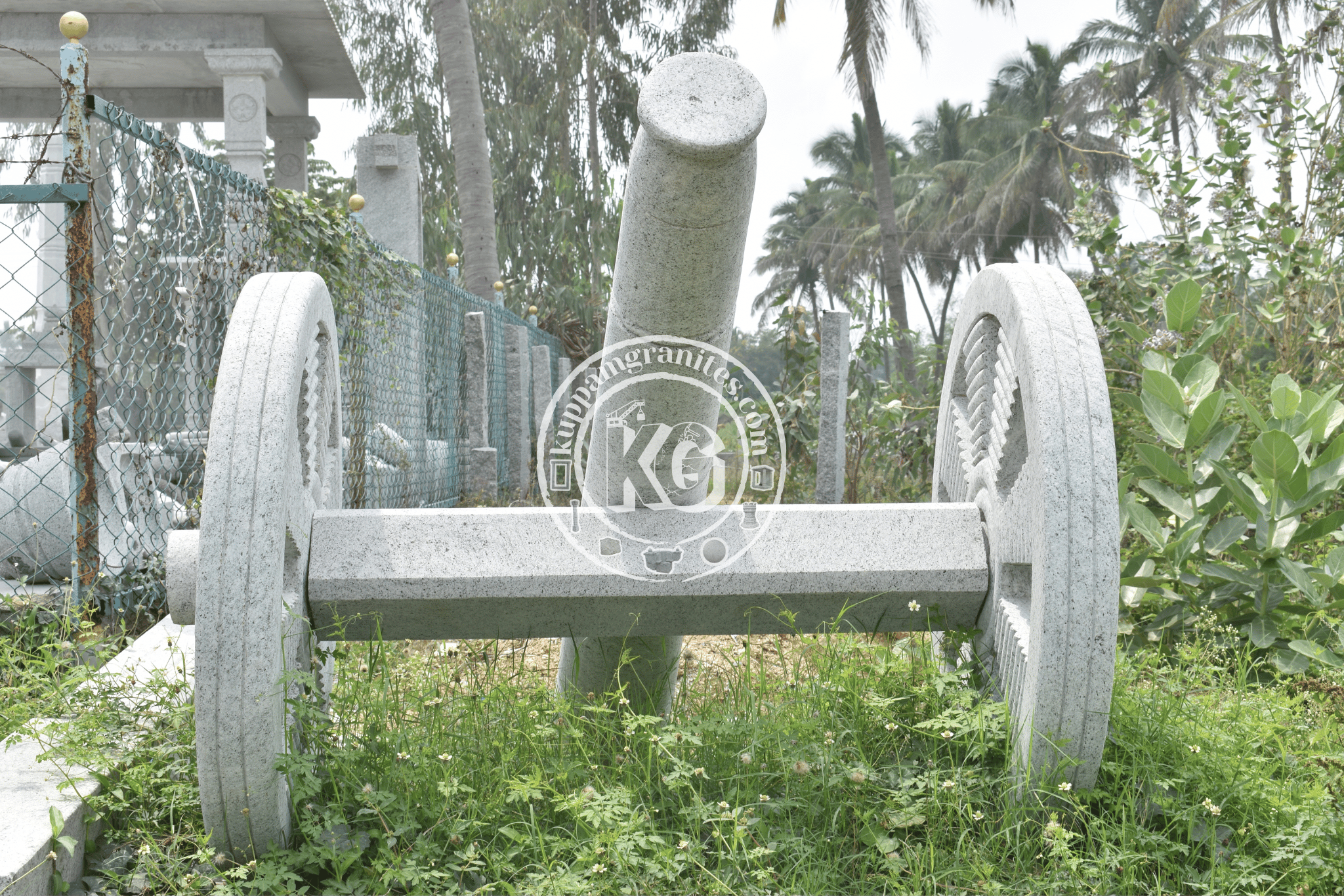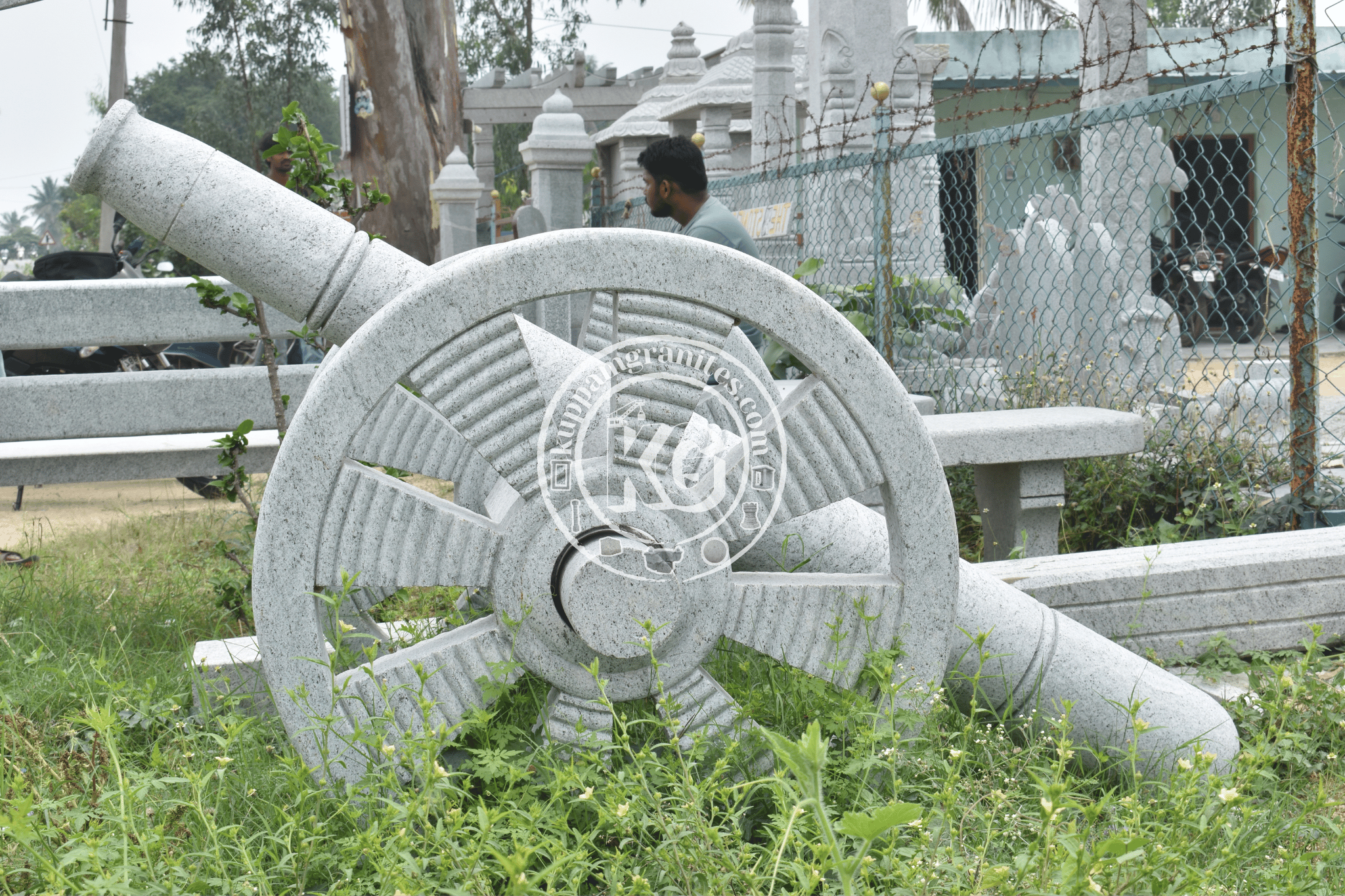 This ornamental granite piece resembles a traditional chariot with two carved wheels and a connecting axle, ideal for garden or temple décor.